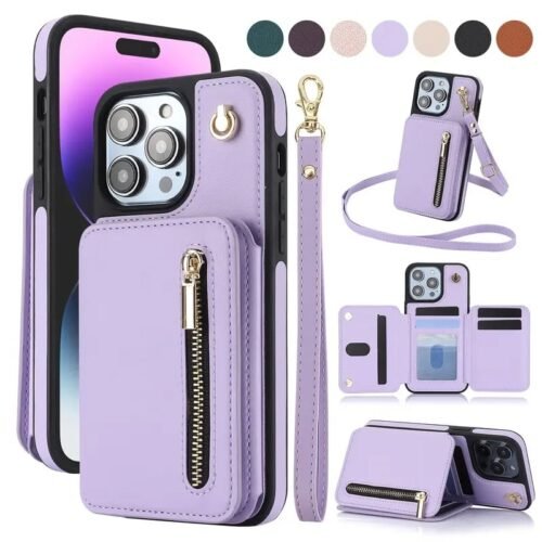 🏆Flash Sale⚡Wallet Case for iPhone 15/14/13/12 – PU Leather Flip Cover with Card Slots, Wrist Strap & Crossbody Lanyard (All Models)