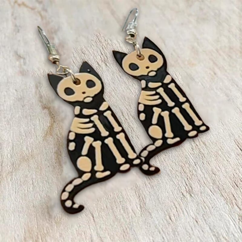 🎃 Adorable Black Cat / Skeleton Cat Wood Dangle Earrings
