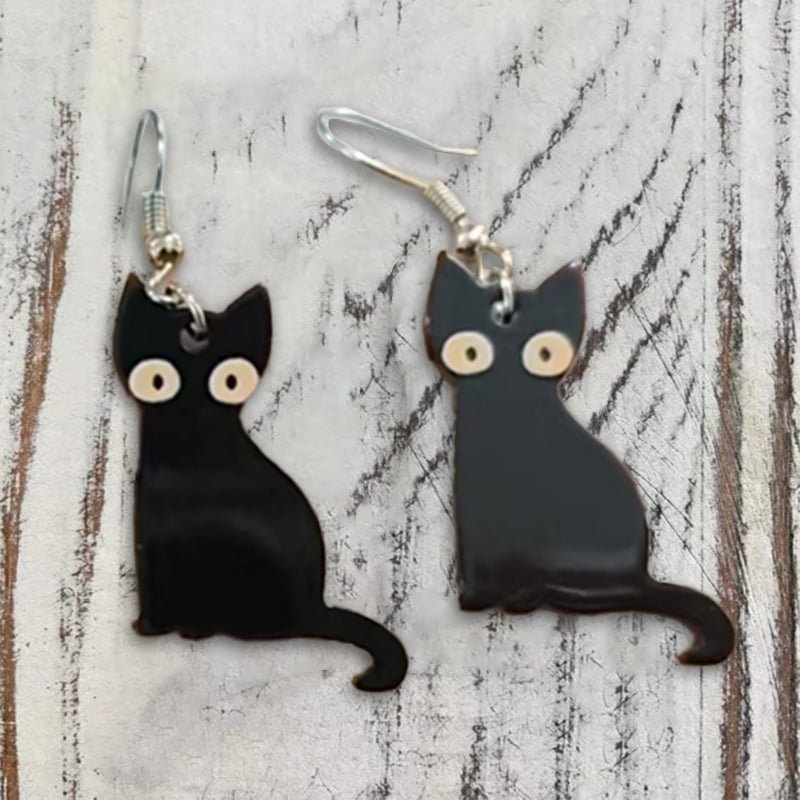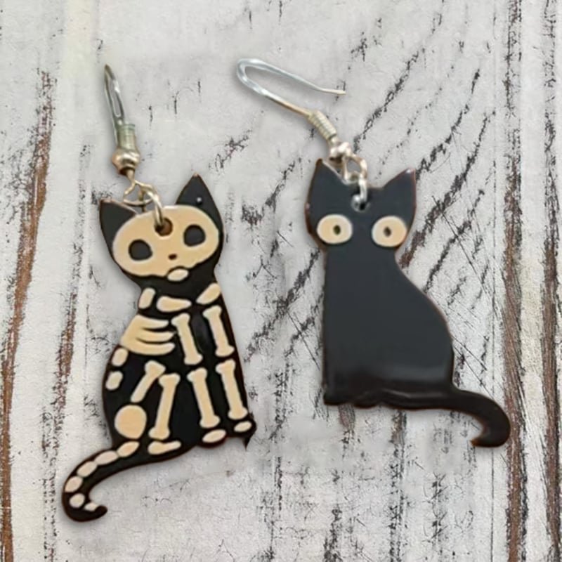 - 1pair*Black Cat / Skeleton Cat Wood Dangle Earrings
